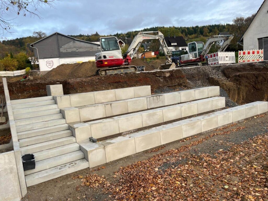 Entlang des neuen Fußwegs sind die Mauerscheiben inzwischen vollständig gesetzt. Besonders schön: Sie wurden bereits mit Einbauspots ausgestattet, die künftig für eine angenehme und stimmungsvolle Beleuchtung sorgen werden. Auch die Sitztribüne nimmt fast ihre endgültige Form an – lediglich in der obersten Reihe fehlen noch ein paar Blöcke, dann ist auch dieser Bereich komplett.